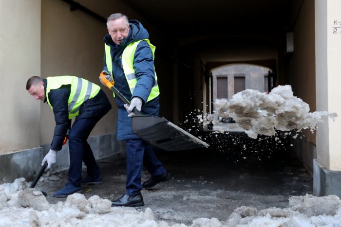 Глава Петроградского (слева) района Иван Громов и губернатор Петербурга Александр Беглов расчищают улицы зимой (простигосподи). Фото Alexander Demianchuk/TASS/Scanpix/Leta