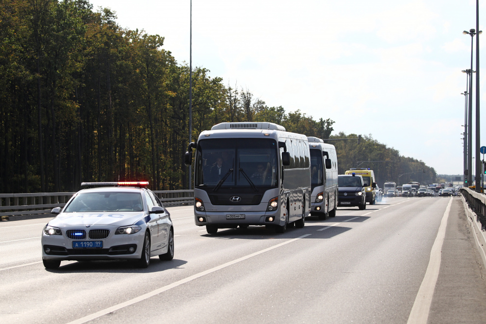 Автобусы с прибывшими по обмену россиянами покидают «Внуково-2». Фото Sergei Bobylev/TASS/Scanpix/Leta