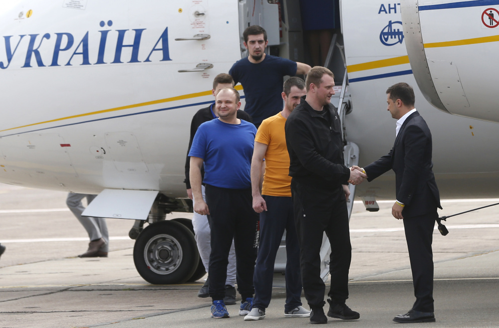 Президент Зеленский первым встречает прибывших украинских заключенных в аэропорту «Борисполь» 7 сентября 2019 года. Фото AP Photo/Efrem Lukatsky/Scanpix/Leta