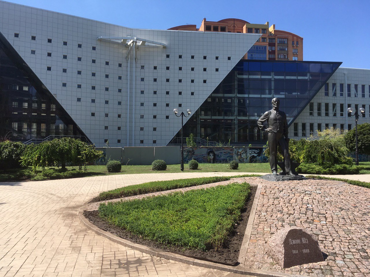 Два символа Донецка — памятник основателю города Джону Юзу и безнадежно остановленное в 2014 году строительство комплекса инновационной библиотеки Донецкого национального технического университета. Август 2019 года. Фото Spektr. Press