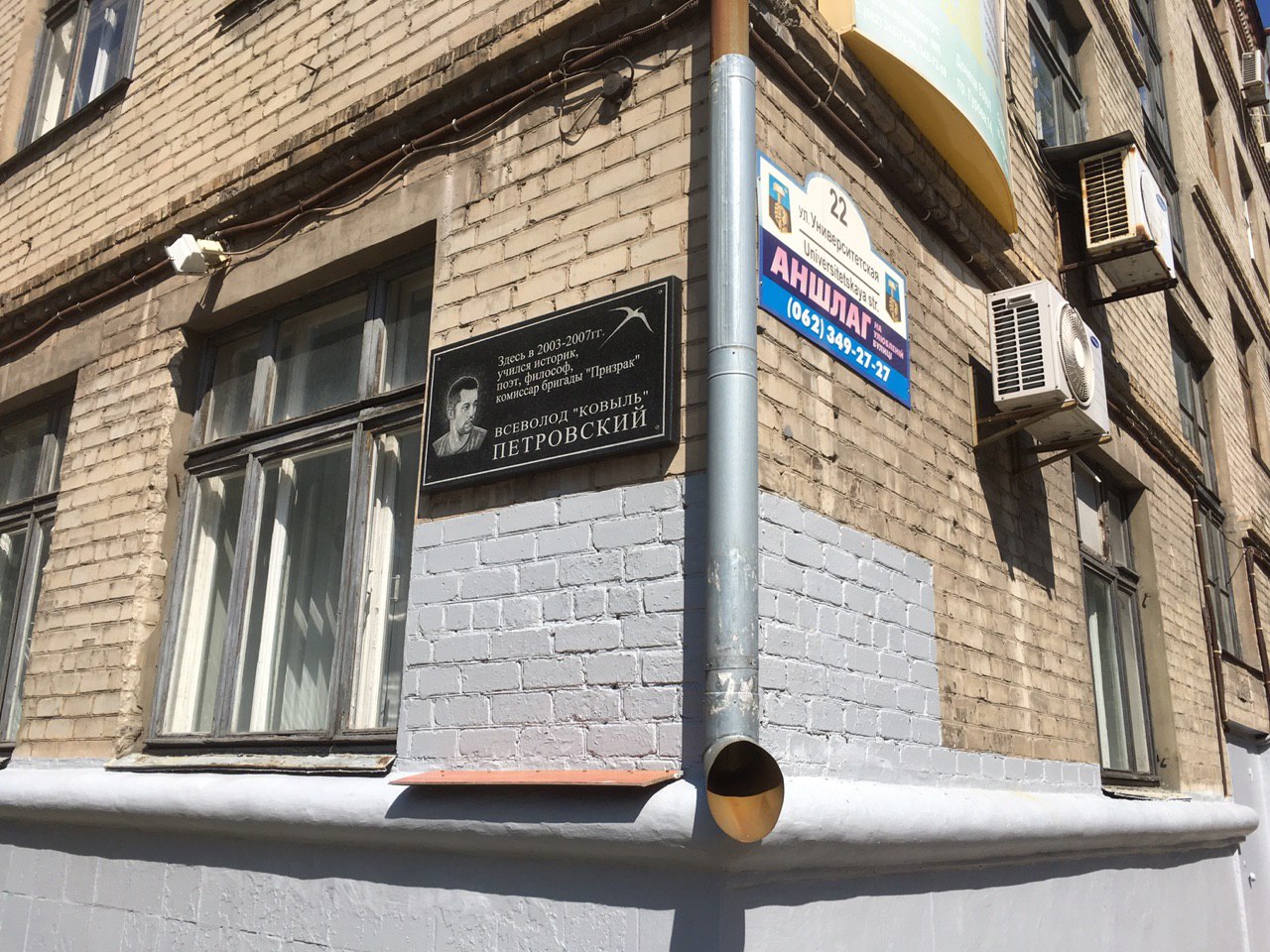 А вот его оставшийся в Донецке двойник — Донецкий национальный университет — корреспондент „Спектра“ посетил в момент окончания вступительной кампании. На углу главного корпуса у него тоже висит новая мемориальная доска — в память погибшего под Дебальцево Всеволода Петровского, он воевал в составе „коммунистического батальона“ бригады „Призрак“ с позывным „Ковыль“.