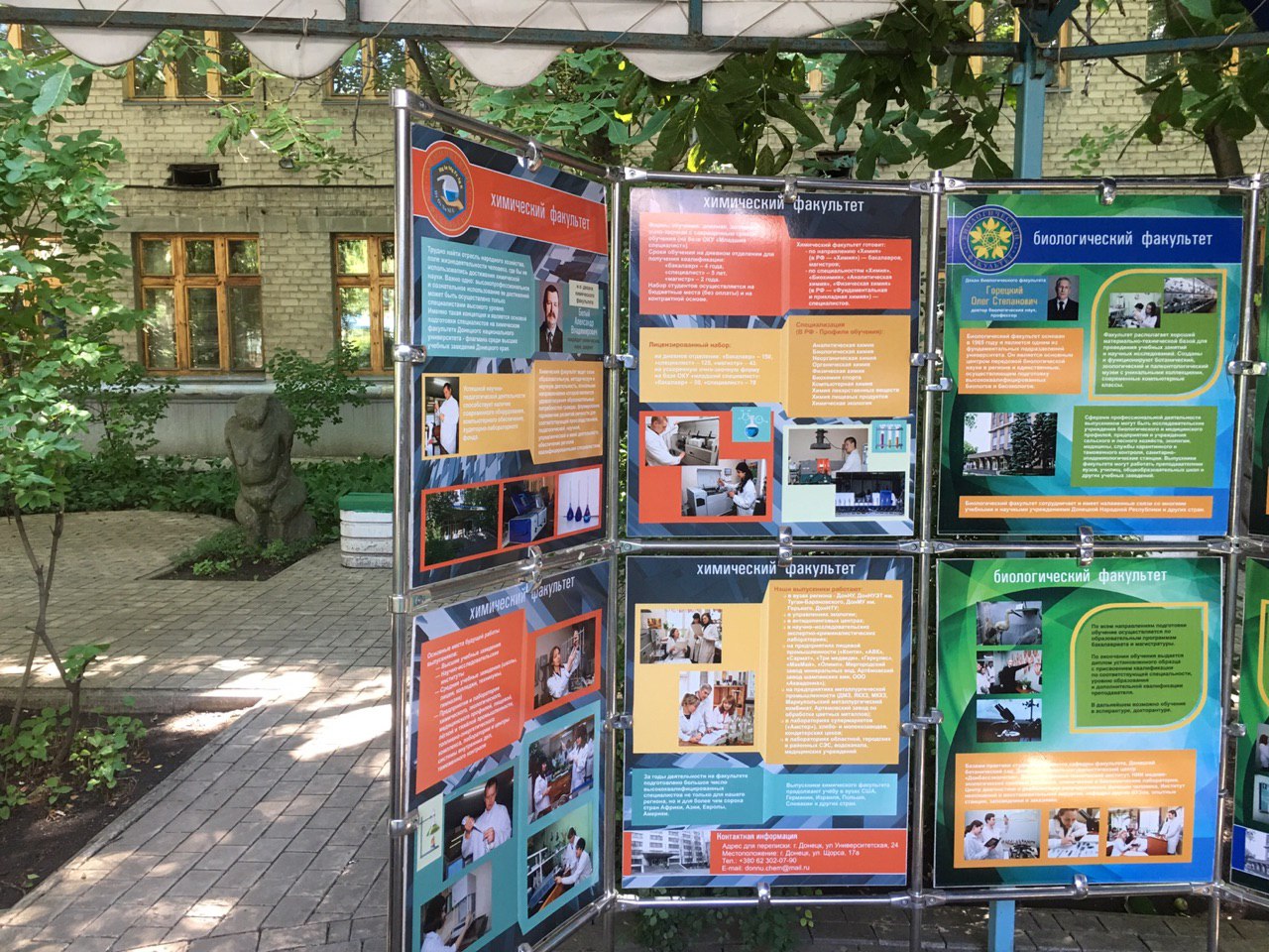 За стеклом в Морфологическом корпусе висели привычные для конца августа списки поступивших абитуриентов, в ДНР они делятся на три части — на бесплатное образование за счет бюджета имеют право дети с местной пропиской. Отдельной графой идут имеющие право на поступление на бюджет по специальной квоте «иностранцы» — соискатели из ЛНР и России. И отдельная небольшая квота для «Гуманитарной программы воссоединения жителей Донбасса». Она финансируется уже пару лет, главная цель — привлечь людей с подконтрольных территорий на неподконтрольные на учебу, лечение, получение социальных выплат для ветеранов в ДНР. http://gum-centr.su/program