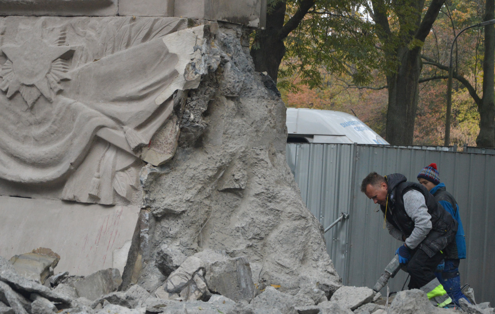 В настоящее время к обнесенному забором памятнику подогнали спецтехнику, электрогенератор и алмазную пилу, после чего рабочие продолжили при помощи отбойных молотков разрушать основание памятника возле фундамента, сообщают РИА Новости.