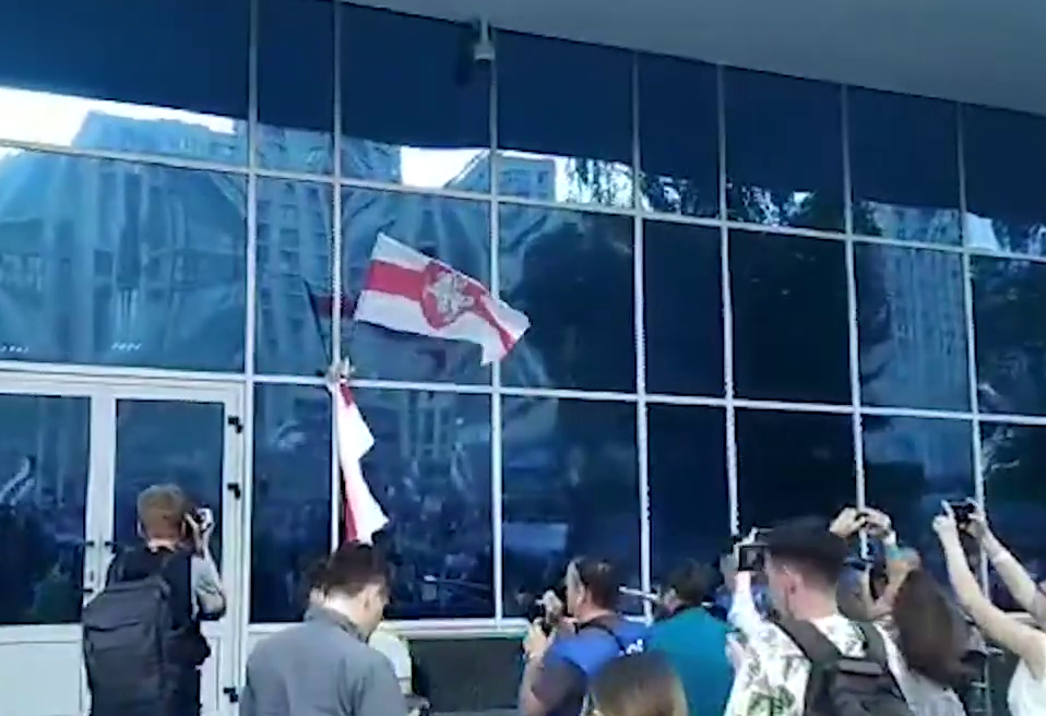 На входе в Белтелерадиокомпанию повесили бело-красно-белый флаг. Скриншот видео Tut.by