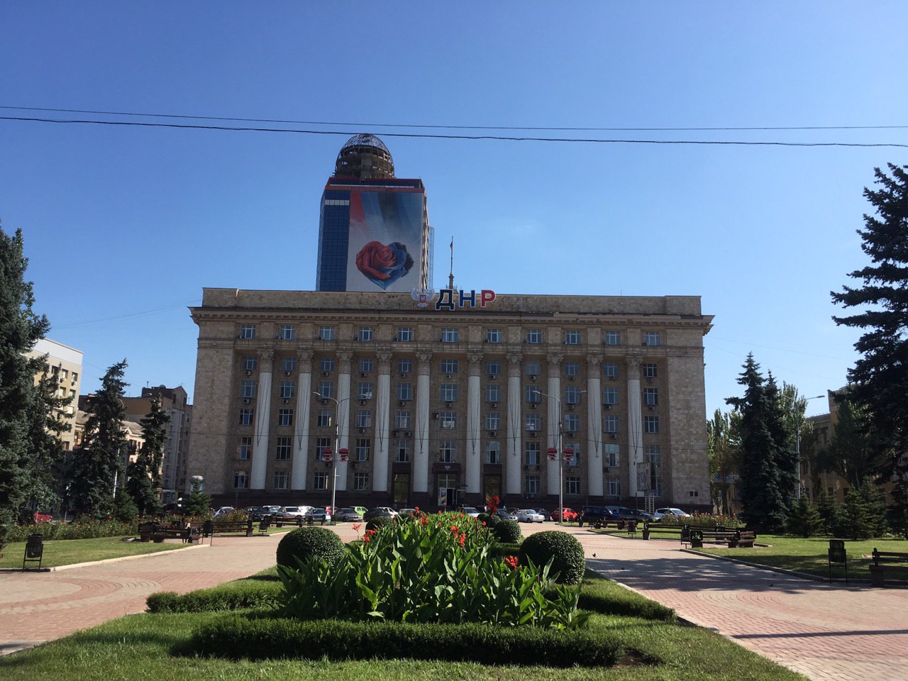 Массовые мероприятия, праздники, концерты приезжих звезд российской эстрады и вездесущая символика и политическая реклама республики в Донецке на каждом шагу. Коммерческой рекламы очень мало и большинство рекламных площадок занято долго не снимаемой патриотической агитацией — поздравления с Днем Победы могут соседствовать с уже выцветшими цитатами, подписанными погибшим год назад главой республики Александром Захарченко, свои агитационные кампании ведут отдельные министерства и сейчас все забивают портреты пятилетних детей, которые «родились вместе с ДНР».