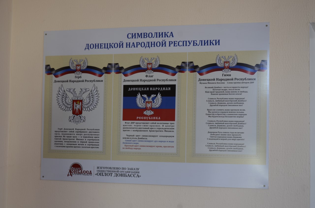 «Как обязательный ввели урок, который теперь называется „урок гражданственности и духовности Донбасса“, он идет один раз в неделю и в основном нацелен на патриотизм. Он не то что самый важный, но к нему внимание самое серьезное, его у нас вообще забрали и его теперь читает директор, — поясняет преподавание основ патриотического воспитания в ДНР Елена Владимировна. — Разговоров о том, что „мы Россия, и Путин наш президент“ на нем нет, в основном упор на Донецкую республику и на ее столицу — Донецк. А гимн ДНР нам сказали, что его все с первого класса должны знать наизусть и в каждом классе висит плакат — герб, гимн и флаг ДНР. Ну и вне уроков каждый ученик знает, как правильно закрывать руками голову в случае обстрела, где прятаться, как и куда идти — это тоже есть».