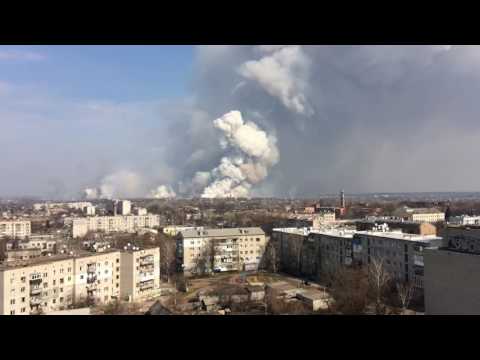 В интернете появилось видео пожара складах хранения боеприпасов в городе Балаклея Харьковской области, в результате чего произошло несколько взрывов. По мнению военного прокурора Украины Анатолия Матиоса, пожар на складах устроили некие «диверсанты».